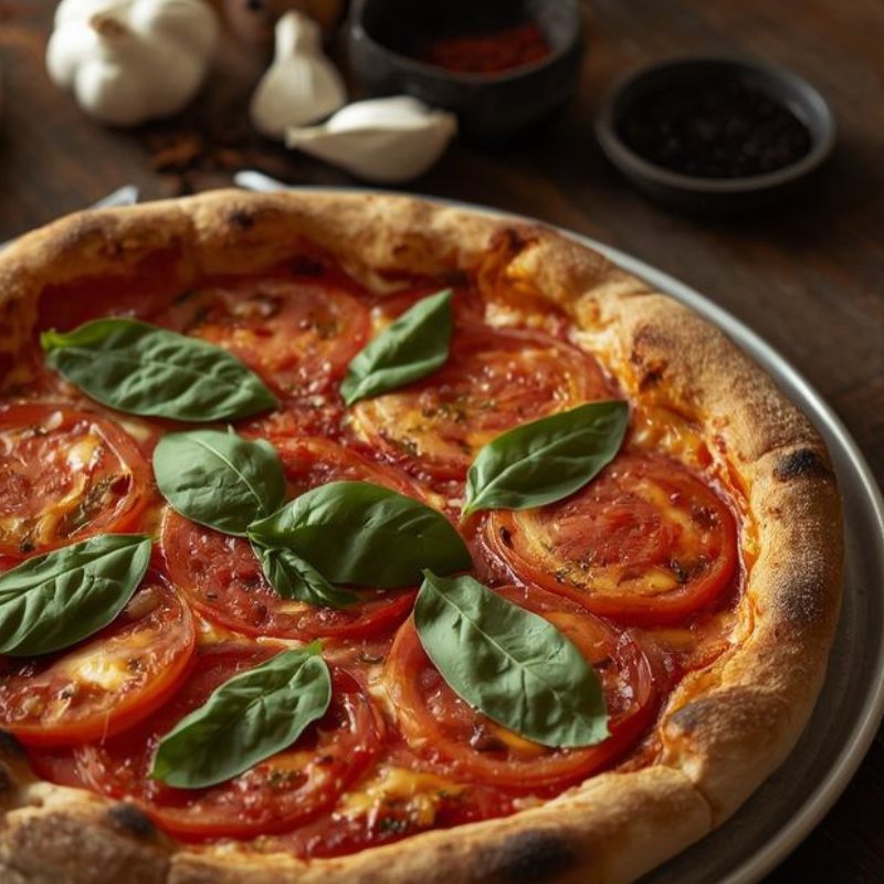 Une pizza relevée, parfumée à l’ail et au basilic frais 🧛♂️🌿🍅