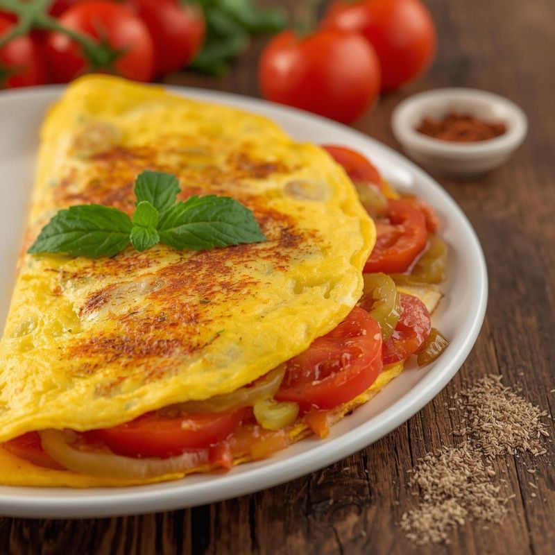 Une omelette généreuse à base d'œufs frais, garnie de tomates, poivrons et oignons sautés. Pleine de couleurs et de saveurs, elle se déguste chaude ou froide, idéale pour tous les moments de la journée.