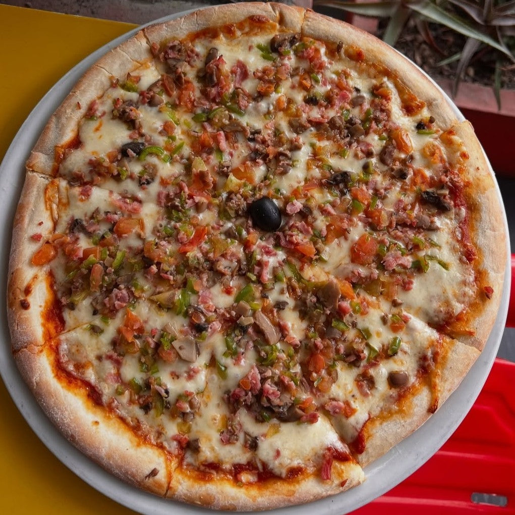 La Pizza Meli-Melo combine tomates, jambon, champignons, oignons, poivrons et basilic finement hachés pour une explosion de saveurs à chaque bouchée. Une pizza riche, équilibrée et parfaite pour les amateurs de diversité gustative.