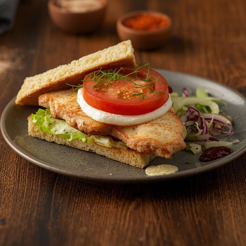 Pain frais garni de poulet tendre, d'œuf cuit, de tomates juteuses et de salade croquante. Un sandwich équilibré, riche en protéines et en saveurs, parfait pour une pause gourmande et saine.